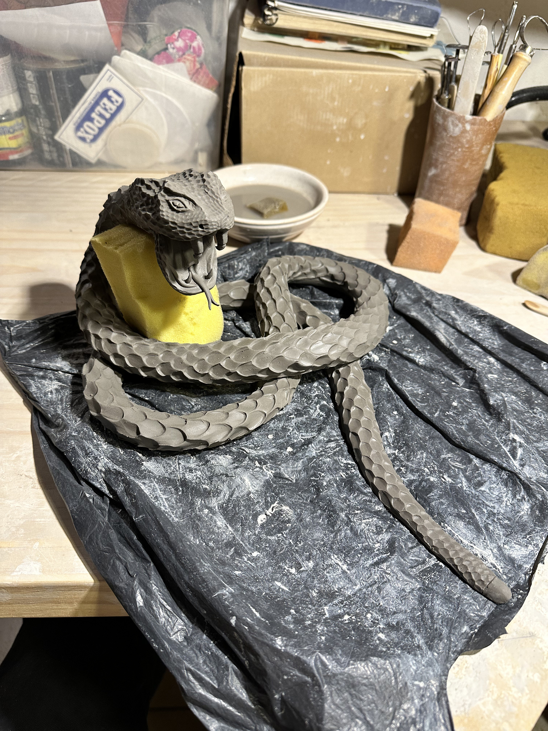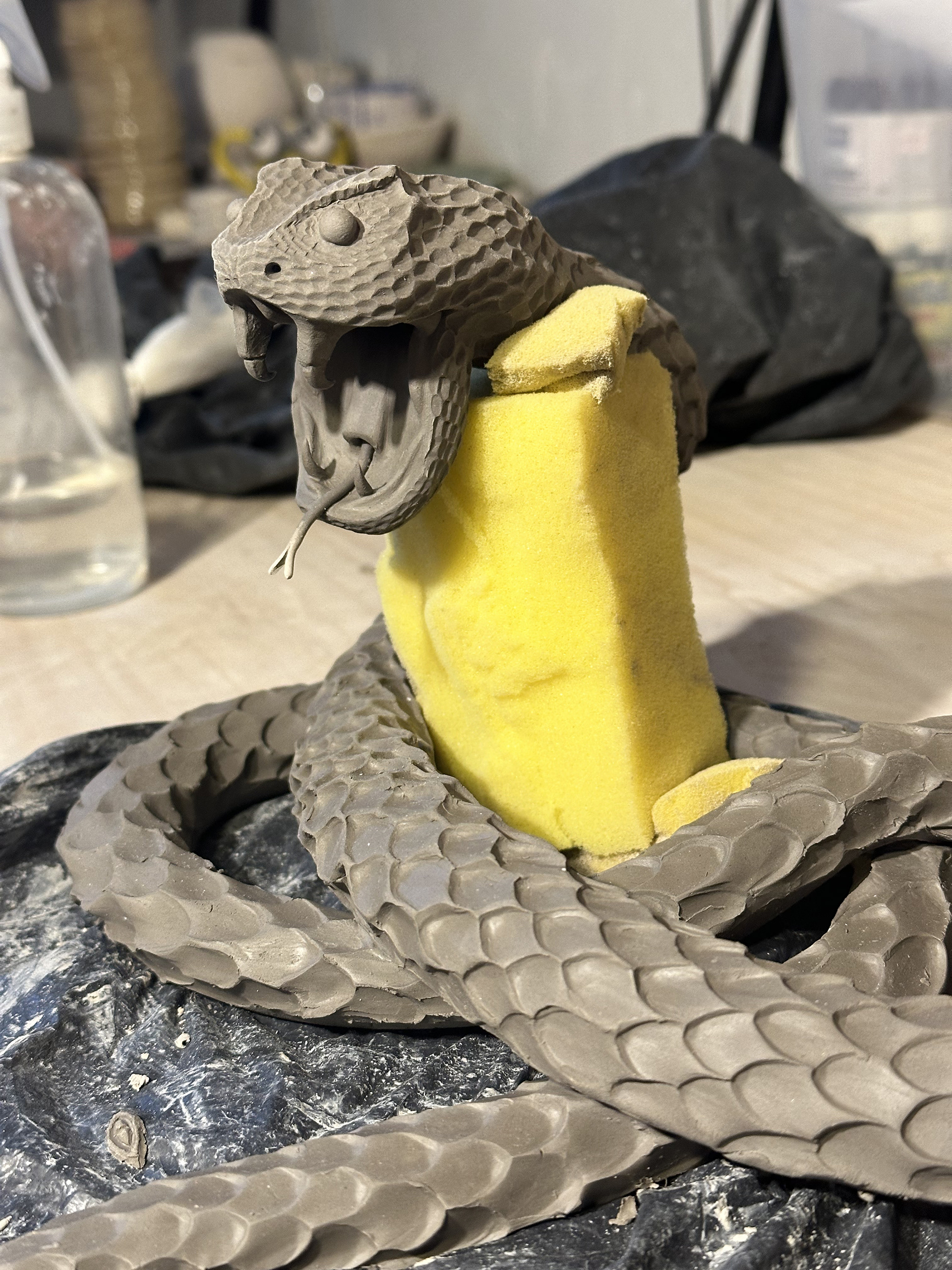 This piece is my own interpretation of the Bush Viper, a snake known for its striking texture, vibrant colors, and hypnotic presence. I was drawn to its intricate anatomy and the way its scales shift in rhythm and density across the body.