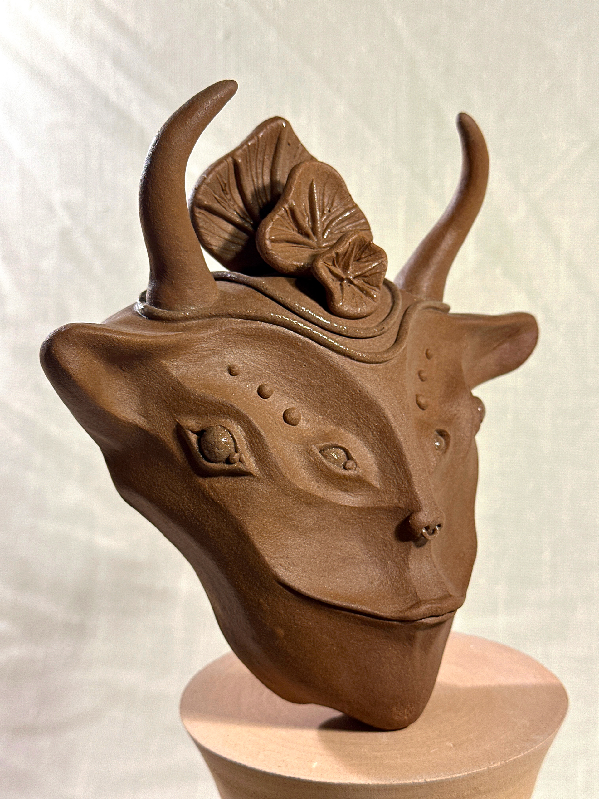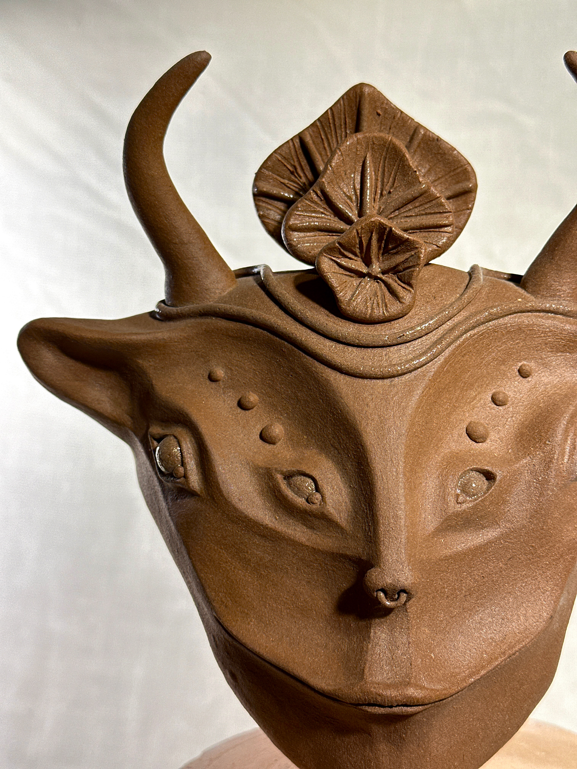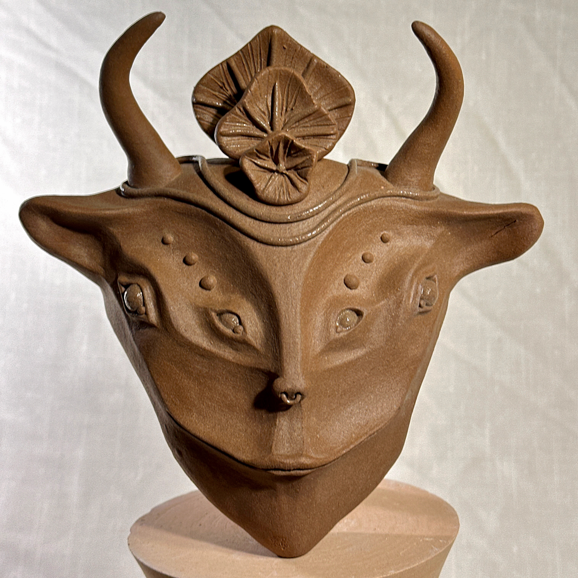 I sculpted this mask using one of my own stoneware clay formulations — a material I developed to carry the energy of the earth with integrity and strength. The surface holds the rawness of soil and the softness of something alive, like bark or mushroom flesh. She is a vessel for abundance — not as excess, but as harmony with the rhythms of nature.