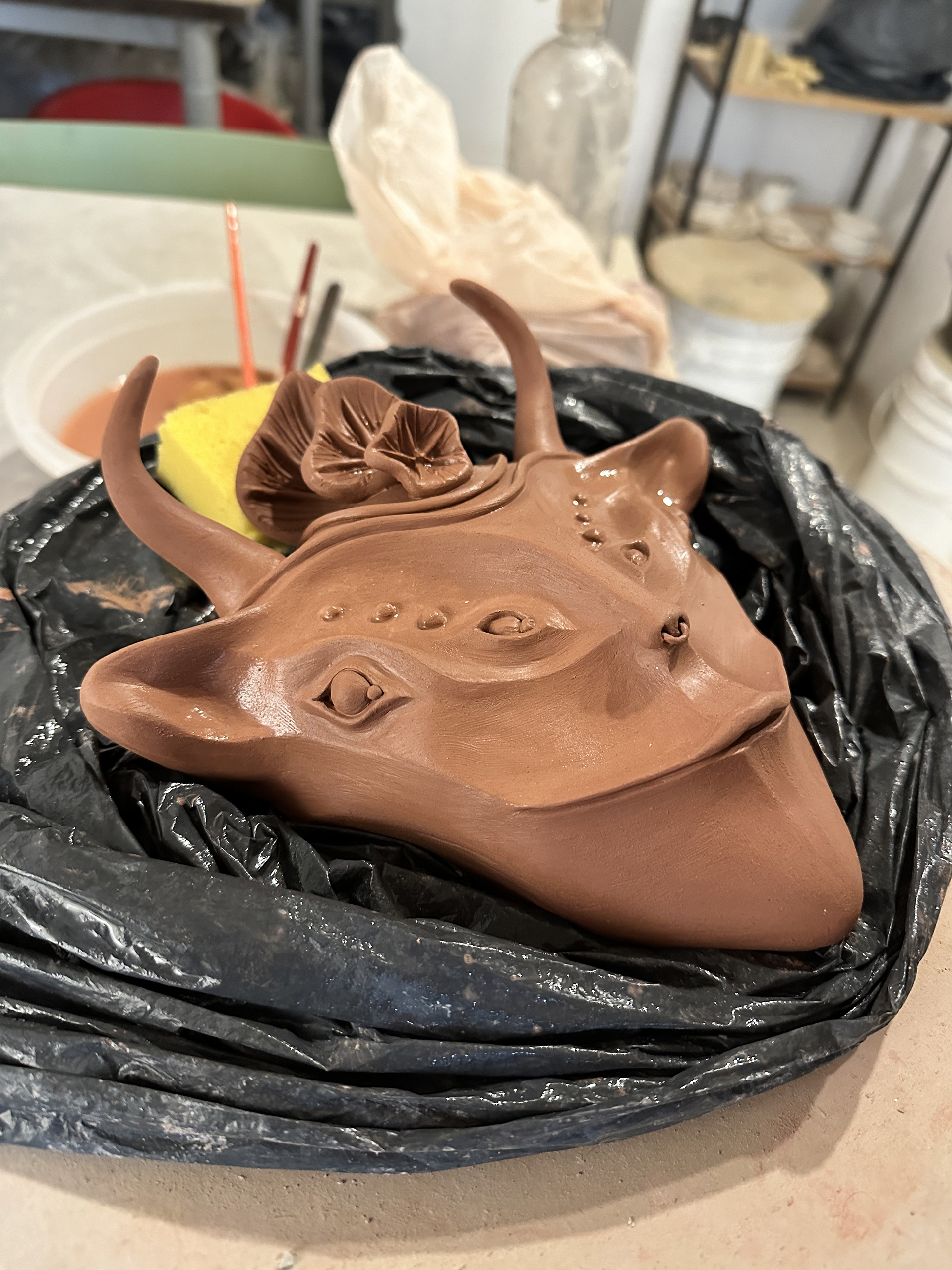 This mask is my interpretation of the Goddess of Abundance in nature — a being born from the interconnectedness of the human, animal, and fungi kingdoms. She emerged as a forest-dwelling creature, something between a nymph and a spirit of wild fertility, embodying the cycles of growth, decay, and regeneration.